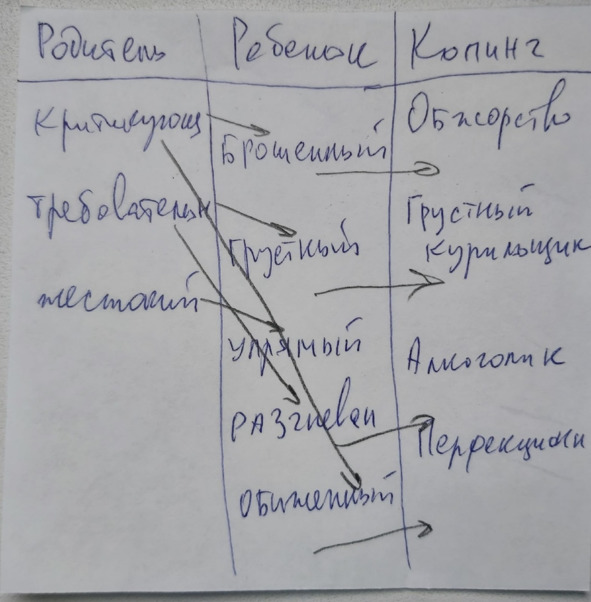 К рисунку: строгий/требовательный/жестокий родитель давит на ребенка, гнобит, и загоняет его в определенные условия, в которых ребенку крайне сложно, тяжело находиться. Ребенок, испытывая дискомфорт (а люди всегда избегают дискомфорт и стремятся к комфорту), стремится от него избавиться, перестать чувствовать дискомфорт, но выйти из ситуации не может по причине собственной зависимости от взрослого (вопрос выживания и обеспечения, я о несовершеннолетних сейчас), а поэтому – находит альтернативный выход.