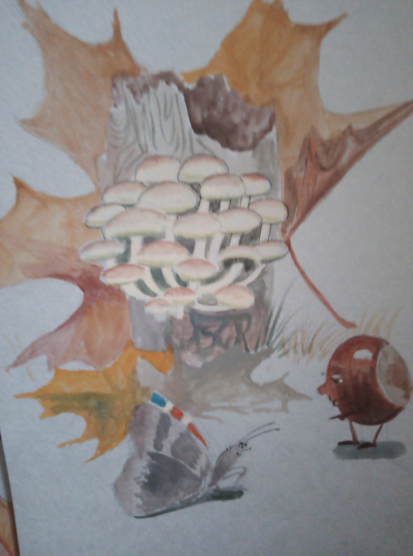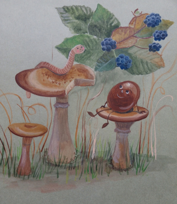 Каштанчик увидел группу грибов, и забрался на один из них. Тут только он разглядел на шляпке большого гриба червяка. Толстого, уплетающего за обе щеки какой -то кусок.