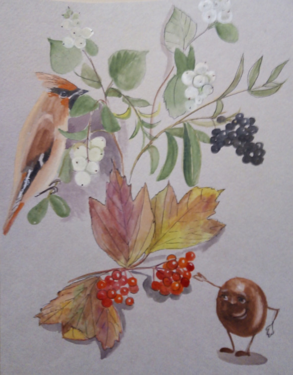 – Какая кругом красота! – думал каштанчик, оглядываясь по сторонам. – Какие разные листья на кустарниках и деревьях! Какие ягоды! Красные, оранжевые, белые, даже чёрные! А вот тёмно синие!