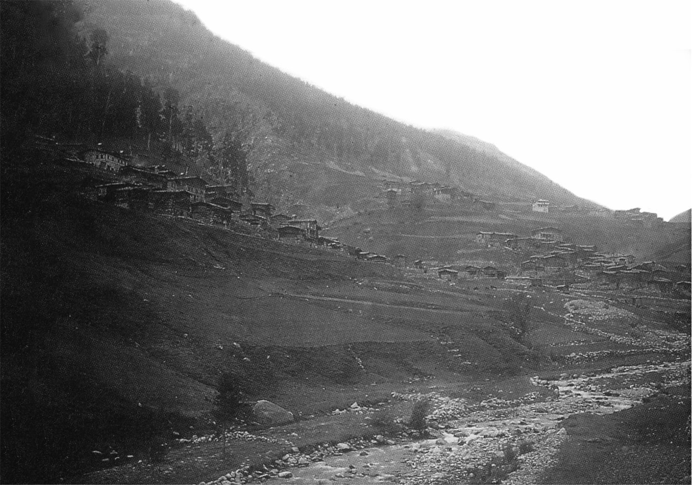 Вот долина открыта нам вся. Это пологий склон правого берега Хевек-суи15, тогда как левый остаётся по-прежнему голым, в осыпях и крутым. Венец склона покрыт сосновым лесом, недалеко тянущимся к западу и густым. Речонка Аисхев делит склон пополам, впадая в Хевек-суи. К востоку мегле Шаразе в 35 деревянных домов, не вплотную расставленных и сходящих вниз. К западу самый Хевек16 в 75 домов, из которых несколько каменных из сизого, как пархальский храм, известняка. Мечеть на видном месте к западной окраине селения. Ущелье Хевек-суи за селом упирается в безлесый левый берег и, видимо, вновь суживаясь, меняет WSW направление на SW и уходит к Хотучурскому хребту. И самый хребет высовывается из-за ближнего склона, зубчатой лестницей поднимающийся к западу в ромбах и звёздах снега, светло-сизого на сизо-чёрных скалах. Солнца нет, и ватные жгуты туч, ободранных и нищающих, с обеденного часа закрывают западное небо и разбросаны по хребтам. Но и так ослепительная зелень пастбищ и посевов проса такая сочная, что вкраплённые в неё дома становятся ласковыми, радушными и навсегда близкими, разгул свежести делает декорацию высот напыщенной, дутой и бездушной, и вдруг нахохлившиеся пики выглядят картонными и неумело покрашенными скверными московскими красками Moewes’a17. Несколько ближе устья Аисхев, справа – ущелье левого притока Кёраметсуи, лишённое леса. В нём лежат села с грузинскими именами Кёрамет и Зенабан, где живут пресловутые христиане окрестностей Пархала. Небольшой вьючный мост в одну арку, каменный, древней кладки, ведёт через Кёрамет-суи. Кладка арок из тёсаного сизого известняка сохранилась безупречно. Поверх неё рваный камень на извести. Мост вымощен булыжником.