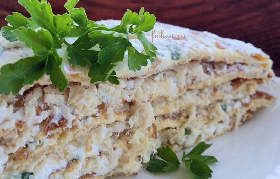 Жарить несколько минут. Потом перевернуть на мясную сторону, накрыть крышкой и подержать так на маленьком огне в два раза дольше, чем жарили первую сторону. Блинчик сложить вдвое, мясом вовнутрь, украсить зеленью.