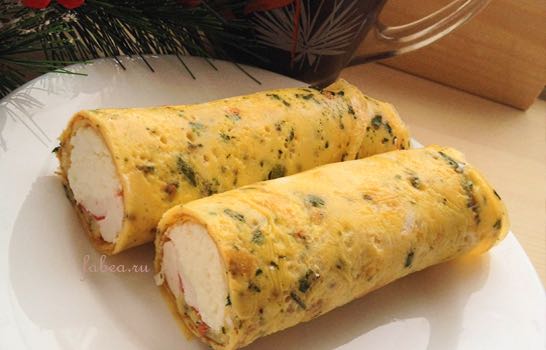 Разогреваем сковороду на среднем огне, смазываем маслом. Выливаем 3 часть яичной массы. Как только блинчик «схватился», закручиваем его рулетом и оставляем на краю сковороды. Под него выливаем ещё смесь и опять закручиваем, когда блинчик начинает припекаться.