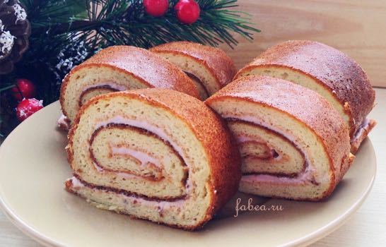 Белки взбиваем до крепких пиков. Все остальные ингредиенты смешиваем. Аккуратно вводим белки. Перемешиваем. Массу выкладываем на силиконовый коврик в виде прямоугольника и отправляем выпекаться в предварительно разогретую духовку. Выпекаем при 200 градусах 15 минут. Корж охлаждаем. Намазываем кремом, скручиваем и оставляем пропитываться.