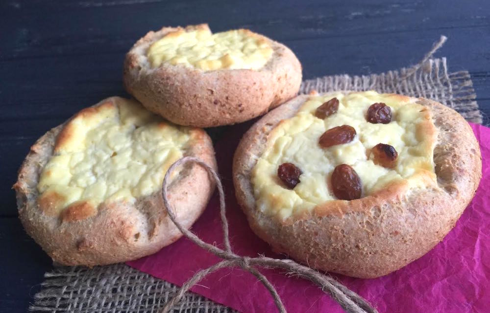 Творог соединить с белком и подсластителем. Ложкой выложить в углубления булочек. Отправить выпекаться при 180 градусах около 30-35 минут.