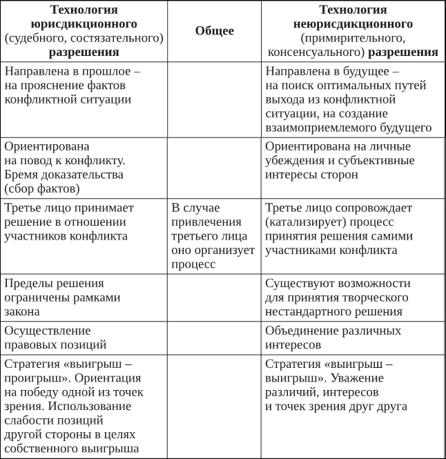 Таблица 1. Сравнительная характеристика технологии юрисдикционного и неюрисдикционного разрешения спора (урегулирования конфликта)