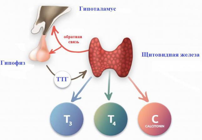 Регуляция синтеза и секреции гормонов щитовидной железы осуществляется центральной нервной системой (ЦНС) через гипоталамо-гипофизарную систему. Гипоталамус секретирует тиреотропин-рилизинг-гормон (ТРГ), который стимулирует выработку гипофизом тиреотропного гормона (ТТГ). ТТГ стимулирует продукцию Т4 клетками щитовидной железы.