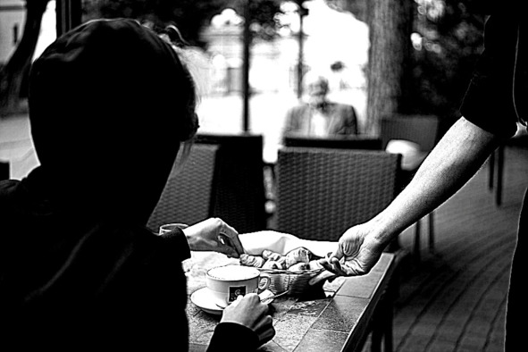 Okay, hurry before you change your mind. Mirror. Eyes: dumplings. Need sunglasses. Slippers will do. The main focus is not stopping. It’s so chilly on the stairwell. I hate the elevator. Jesus, how many steps are there!? It’s quiet outside. Too quiet. I need to cross the road and sit at that table in the shade. The sparrows are chirping so loudly here. Cappuccino, please. And something for the sparrows, or against sparrows?