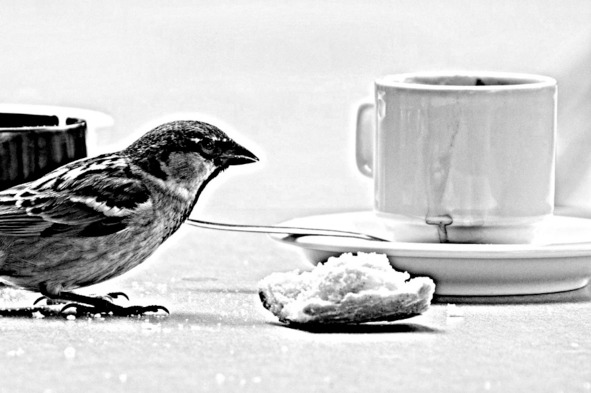 Why is he looking at me like that? Did I think that or did I say it out loud? There must be some way out. Yes, a croissant is perfect. Better two; there are many of them. Two were not enough. It seems I enjoy feeding sparrows. When they eat, they are silent.