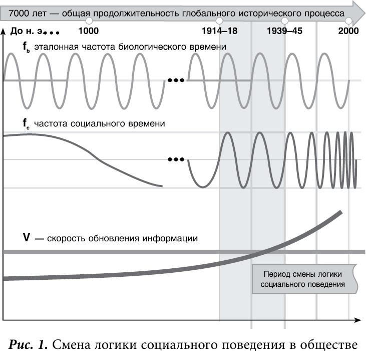 Бернард ШоуНа рубеже III тысячелетия планета Земля переходит из созвездия Рыб (148 г. до н. э.–2012 г. н. э.) в созвездие Водолея (2012–4172 гг.). Эта глобальная трансформация на астрологическом плане сопровождается уникальными переменами в информационном состоянии общества. В соответствии с Законом времени постоянно сокращающийся период обновления господствующих на планете Земля технологий (социальное время) в середине XX века сравнялся с неизменным (25 лет) во времени периодом смены поколений (биологическое время), а после этого, впервые в истории нынешней цивилизации, технологии стали обновляться за более короткое время, чем поколения. Это обстоятельство с неизбежностью порождает процесс смены логики социального поведения, который входит в активную фазу лишь в третьем поколении после выравнивания частот биологического и социального времени, то есть как раз на рубеже тысячелетий. В период до 2000 года логика социального поведения носила толпо-элитарный характер на всех уровнях социальной власти, организованной по принципу пирамиды с разделением всего общества на толпу и элиту. На верху глобальной пирамиды находился узкий круг посвященных (элита), ниже следовали их доверенные и приближенные, под каждым из них выстраивались локальные пирамиды с вовлечением толпы в их состав.