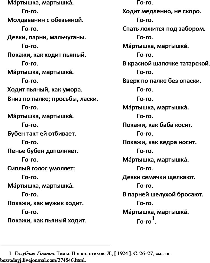 Именовать таких обезьянок, как и ученых медведиц, принято было Марь Иваннами («Как сморщенный зверек в тибетском храме: / Почешется – и в цинковую ванну, – / Изобрази еще нам, Марь Иванна» [Мандельштам, «Полночь в Москве. Роскошно буддийское лето…», 1931][62]; «Марьей Ивановной называлась обезьяна, самка, из породы павианов. ‹…› Подарили мне ее мои друзья…» [Куприн, «Марья Ивановна», 1913][63]; «Иногда шарманщик появлялся с обезьянкой на цепочке, одетой в курточку или платье и обученной показывать простейшие трюки, вроде „Как Марья Ивановна за водой идет“»[64]; «Иногда к нам заходил Петрушка или цыган с ‹…› обезьянкой Марьей Ивановной»[65] и многие другие), а самцов – Макарами Ивановичами («Имя было дано Макару Ивановичу [игрушке. – В.З.] по имени тех обезьянок, с которыми в годы нашего детства ходили по дворам черномазые люди. Этих мартышек почему-то часто звали так»)[66]. Музыкальная составляющая действа также не балует разнообразием: песня «Шумит Марица…», первый гимн освобожденной Болгарии[67], равно упоминается в стихотворении Белого «Из окна» и в позднейшем (опубл. 1962) мемуарном фрагменте знакомца Ходасевича В.Г. Лидина («Во двор нашего дома ‹…› приходил серб с шарманкой через плечо и печальной обезьянкой, в красных шароварах и цветной распашонке из ситца. ‹…› Серб, грустный, с беловатыми оспинами на смуглом лице, крутил ручку шарманки, уныло тянувшей „Шум на Марице…“, а обезьянка с близко поставленными, серьезными глазами, словно знающая заранее свою судьбу, сидела на шарманке, ее тонкие ручки с пепельными ладонями высовывались из полурукавов распашонки»)[68]. Незамысловатый речитатив обезьянщика с бубном запечатлен в повести Вен. Корчемного «Лунная соната» («Обезьянка прыгала в пыли и вытворяла какие-то в высшей степени неопределенные гримасы, а цыганенок бил рукой в бубны и гнусаво выводил: „Покажи, как стара баба / Ходит на базар. / Ах ты, бэреза, / Русска молодец!“»)[69], и он же различим в макабрическом стихотворении поэта Голубчика-Гостова (ближе не известен), на которое указал А.Л. Соболев в блоге М.В. Безродного: