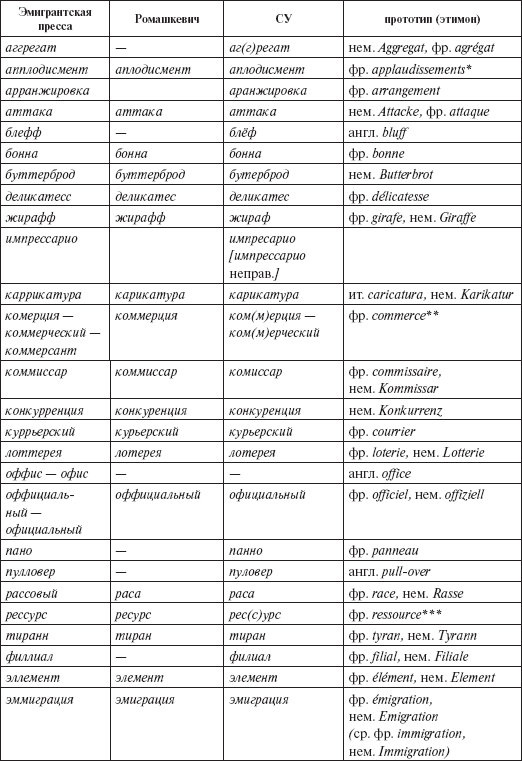 Таблица явственно свидетельствует об отходе от написаний иностранных слов с двойными согласными, рекомендуемых в русских орфографических словарях, например, конца XIX – начала XX в. Графическая форма слов, принятая в орфографической практике той или иной страны проживания русских эмигрантов, несомненно, влияла как на адаптацию новых заимствований, так и на трансформацию написания старых. Особенно сильным было немецкое влияние, в результате побеждавшее графический облик слов, ранее заимствованных из французского (агрегат, жираф, комиссар, лотерея, раса, тиран); французское влияние, судя по нашему корпусу, несколько уступало немецкому: аплодисмент → апплодисмент, аранжировка → арранжировка, ресурс → рессурс, курьерский → куррьерский, конкуренция → конкурренция. Возможны были и альтернативные варианты написания как ориентация на фонетический и графический критерии:
