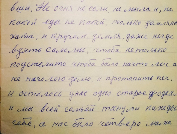 Мне очень грустно вспоминать всё это. Какие же сейчас счастливые дети! Как рассказать им, каким было наше детство, в котором был голод, холод и когда всё твоё имущество – это твои вши? Не было у нас ни огня, ни мыла, ни соли, ни еды никакой, а только земляная хата. И негде взять соломы, чтобы постелить на голую землю, на которой мы спали. И нечем растопить печь. Осталось у нас только старое одеяло, одно на всех, и каждый тянул его на себя.