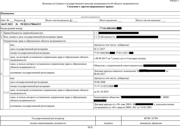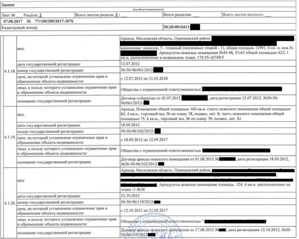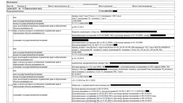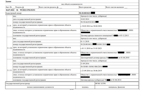 Как видно, и по данному объекту также уже никаких сведений в части арендуемых площадей в выписке нет. Для полного понимания следует отметить, что в указанных выписках из ЕГРН содержаться сведения в том числе о тех договорах аренды, которые были зарегистрированы ранее и которые до сих пор действуют. Но сведения об описании переданных в аренду объектов из них исчезли (вернее, более не указываются).