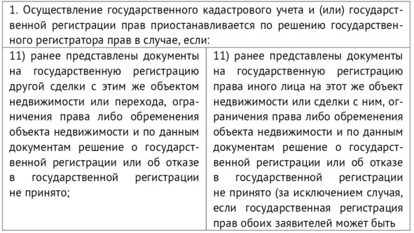 Как видно, пункт 11) ч. 1 ст. 26 Закона был дополнен следующим положением «… (за исключением случая, если государственная регистрация прав обоих заявителей может быть осуществлена одновременно (последовательно) и (или) независимо друг от друга, либо если документ, на основании которого ранее заявлена государственная регистрация права, признан судом недействительным, либо если судом признано недействительным (отсутствующим) право, заявление о государственной регистрации которого представлено ранее). Какое практическое значение имеют указанные дополнения для заключения договоров аренды?