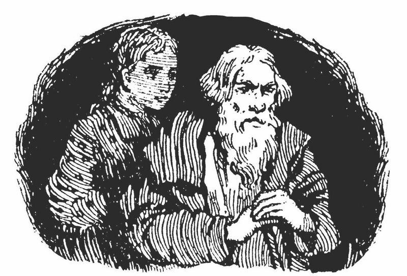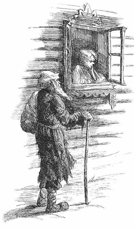 Слева, с другой стороны оврага, шёл по мосту старик-нищий (в ту зиму много ходило по деревням нищих, потому что везде был голод). Увидав открытое окно у Шашиных, старик вдруг заторопился. Он сообразил, что ему выгоднее получить милостыню из окна, чем подниматься на крыльцо и потом отворить и затворить три двери. Минуя избу Дёминых, он прямо направился к открытому окну и, не дойдя шагов пять, взял палку из правой руки в левую, снял шапку и занёс руку над головою, чтобы перекреститься. Петя услышал его шаги, обернулся влево и, когда увидал нищего, быстро, как бы испугавшись, спрятался, захлопнув окошко.