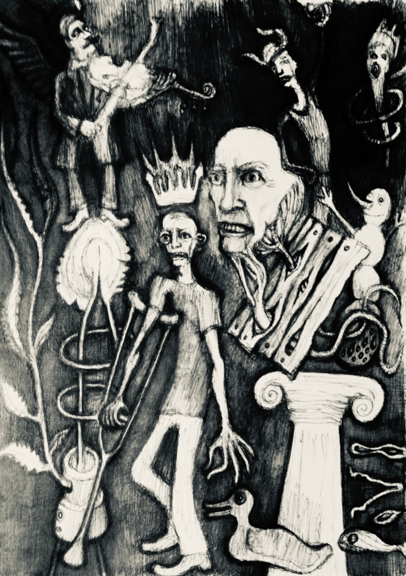 В магазине на кремовом мраморе стоит рогатый товарищ и смотрит, как уборщица моет пол. Мокрая отвратительная тряпка ползет по мрамору, перемешивая грязь от сапог и галош. Рогатый прячет звериное лицо под маску доброго человека. Звучит красивая музыка, кто-то медленно перебирает струны арфы. Рогатому каким-то чудесным образом удавалось совмещать две вещи – он работал главным инженером на каком-то заводе и еще он успевал делать свои злые дела – дарить боль, слезы и воспоминания. На нем был надет пасмурный плащ, а на голове у него могла бы быть мятая шляпа, но ее не было.