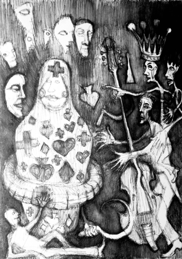 Рогатый снова переоделся. Теперь на нем безобразный колпак и красная мантия, он теперь – судья. Он что-то пишет шариковой ручкой, очень рассудительный товарищ. У него пухлые пальцы. За спиной у него – роскошное знамя. Кажется, я начинаю видеть его положительные черты.