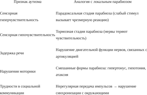 Какие признаки аутизма могут быть объяснены феноменом локального парабиоза?