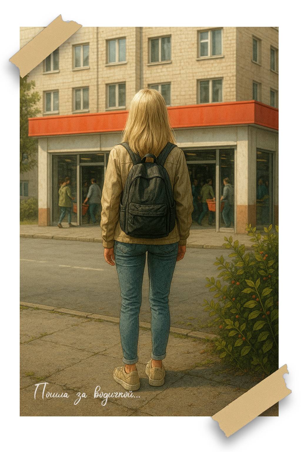 Позади неё стоял мужчина с растрёпанными волосами и дёргаными движениями. Он бормотал что-то себе под нос, быстро, сбивчиво, словно пытался удержать мысли, которые разлетались в разные стороны. От этого становилось ещё тревожнее. Очень хотелось уйти. Но пить хотелось больше.