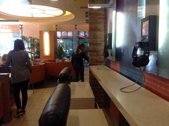 What was in this unusual bistro is the headphones installed in the wall, where you can listen to music at dinner, choosing to your taste. There are classical music, pop, country and anything. Never seen this.