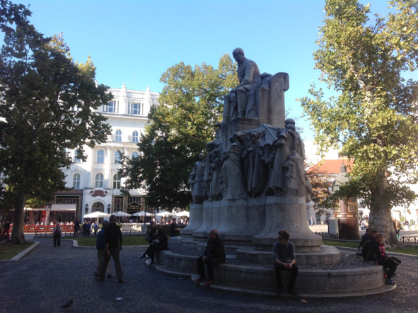 In the shade of trees and surrounded by shops on the first floors of houses on the square there is a monument to a poet from Carrara marble (Italian Alps).