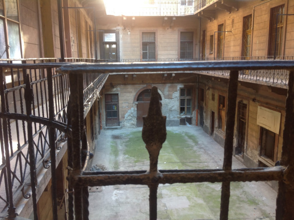 At the same time, the building was under reconstruction. The builders were already downstairs, they were pouring concrete into the arch. And at the top of the renovation has not yet been started – shabby walls, an old elevator – all this reminded of the Hungarian routine of the 1970s.