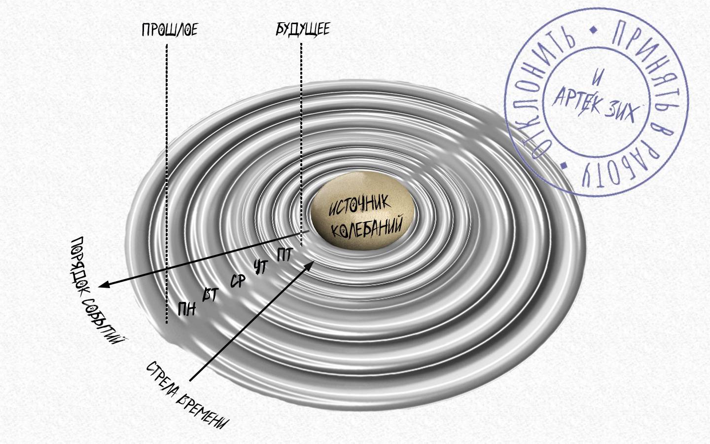 Теперь же если провести стрелочку от самой внешней волны до места падения камешка, то у автора выходит не что иное, как стрела времени. Потому что, как известно, «стрела времени» – это одностороннее течение времени от прошлого к будущему, например, так: понедельник, вторник, среда, четверг, пятница, суббота, воскресенье… Здесь стрела времени проводится от понедельника к воскресенью, от более раннего к более позднему и так далее. И если источник колебаний до сих пор считался настоящим моментом времени, то теперь же он становится конечным будущим относительно «понедельника» («вторника» и так далее). А значит, самый внешний круг можно отметить как первоначальное прошлое, а эпицентр колебаний будет считаться не только «моментом сейчас», но ещё и конечным будущим, если считать от первоначального прошлого.