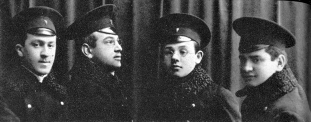 Илл. 2. Бабель и его товарищи по училищу (слева направо: А. Вайнтруб, A. Крахмальников, И. Бабель, И. Лившиц)