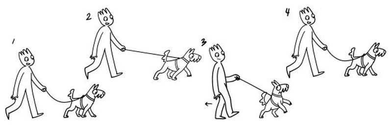 При отшагивании назад длина поводка не меняется, руки от корпуса не отделяются, поэтому хозяин как бы утягивает собаку за собой тоже назад. После этих одного-двух шагов, без замедления и без остановки, хозяин вновь делает шаг вперед. Но так как собаку вы успели стянуть ближе к себе, то в этот момент она оказывается на провисшем поводке.
