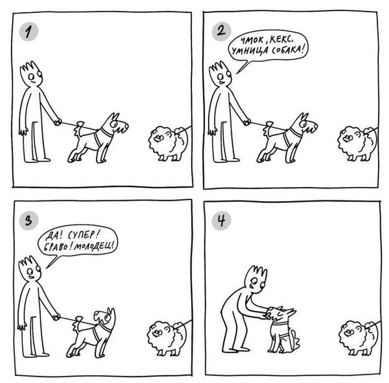 В конечном счете к раздражителю можно будет подойти, но не это задача упражнения. Напоминаю, что важно сначала работать с большой дистанции, не форсируйте события. Повторите упражнение 10–15 раз. Если ваш пёсель усердно начинает смотреть на вас (неудивительно, еда-то у вас в карманцах, а раздражитель вроде как далеко), помогите собаке немного расслабиться и отвернуться от вас. Например, можно показать пустые ладошки или немного повернуть от мокроносого своё лицо, рассеять взгляд. Нам важно, чтобы собака имела с раздражителем серию взглядов и отворотов головы, а не один с последующей концентрацией на хозяине (здесь можно вспомнить неудачный пример с Роней, когда собаку обучали делать вид, что котика не существует и не смотреть на него).