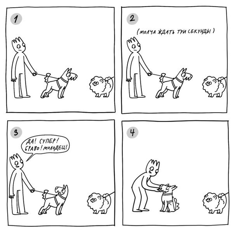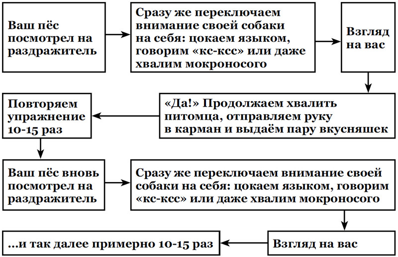 Итак: взгляд собаки на раздражитель – в эту же секунду хозяин голосом переключает внимание на себя: клацанье, кыс-кысс, возможно, похвала – питомец переводит взгляд на хозяина – маркер «да» и еще больше похвалы – вот теперь отправляем руку в карман и выдаем вкусняшку.