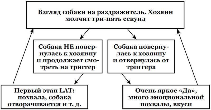 2. Собака просто не успевает показать плохое поведение (лай, страх или натяжение поводка), потому что быстро отворачивается от объекта и смотрит на хозяина, значит автоматически подкрепляется и реакция тишины и спокойствия.