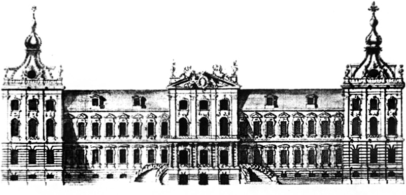 На углах стены предполагалось возвести небольшие павильоны-люстгаузы. Любопытно, что при всех последующих перестройках дворца число окон по фасадам дворца осталось неизменным.