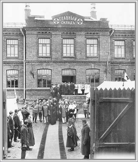 Вдовствующая императрица Мария Федоровна и сопровождающие ее лица выходят из здания Главного склада Российского общества Красного Креста в Санкт-Петербурге (Корпусное шоссе, 1) 1912–1913 гг. Фото ателье К. Буллы. ЦГАКФФД СПб.
