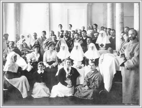 Группа медицинского персонала и раненые в Дворцовом лазарете с императрицей и великими княжнами (во 2-м ряду сидят слева направо: великие княжны Анастасия, Мария и Ольга Николаевны, императрица Александра Федоровна, великая княжна Татьяна Николаевна: в 3-м ряду стоит справа у колонны дочь английского посла Мириэль Бьюкстен). Царское Село. 1915 г. ЦГАКФФД СПб.