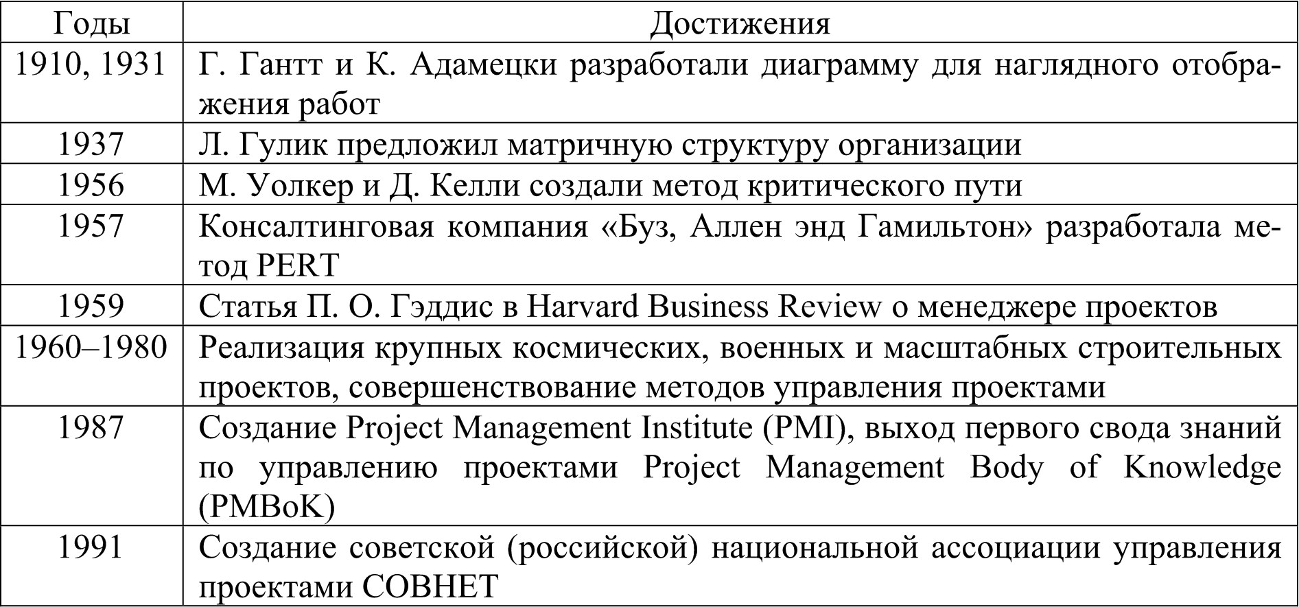 Впоследствии концепция управления проектами продолжала развиваться, вбирая в себя основные достижения управленческой науки – в области управления рисками, персоналом и др., формируясь при этом в самостоятельную строгую логичную дисциплину (табл. 1.1).