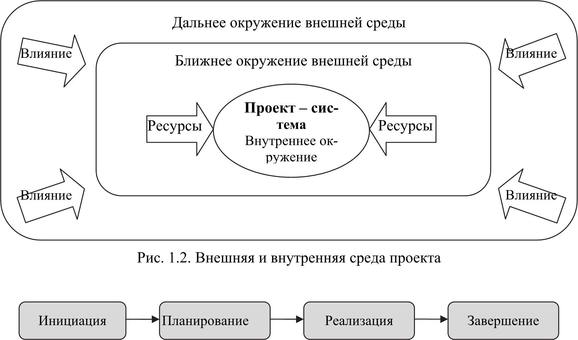 Проект представляет собой сложную систему открытого типа, для которой характерны внутренняя и внешняя среда, сформированные из факторов и объектов, оказывающих влияние на проект (рис. 1.2).