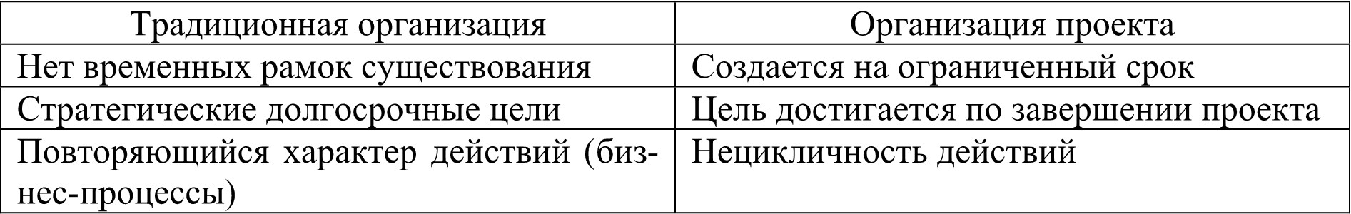 Особенности организации проекта в сравнении с традиционной организацией приведены в табл. 1.2. Традиционная организация создается на длительное время, стремится к достижению стратегических целей, основу ее существования формируют повторяющиеся бизнес–процессы. В то время как проект создается на ограниченный срок для достижения конкретной цели, и работы в нем имеют нецикличный характер.
