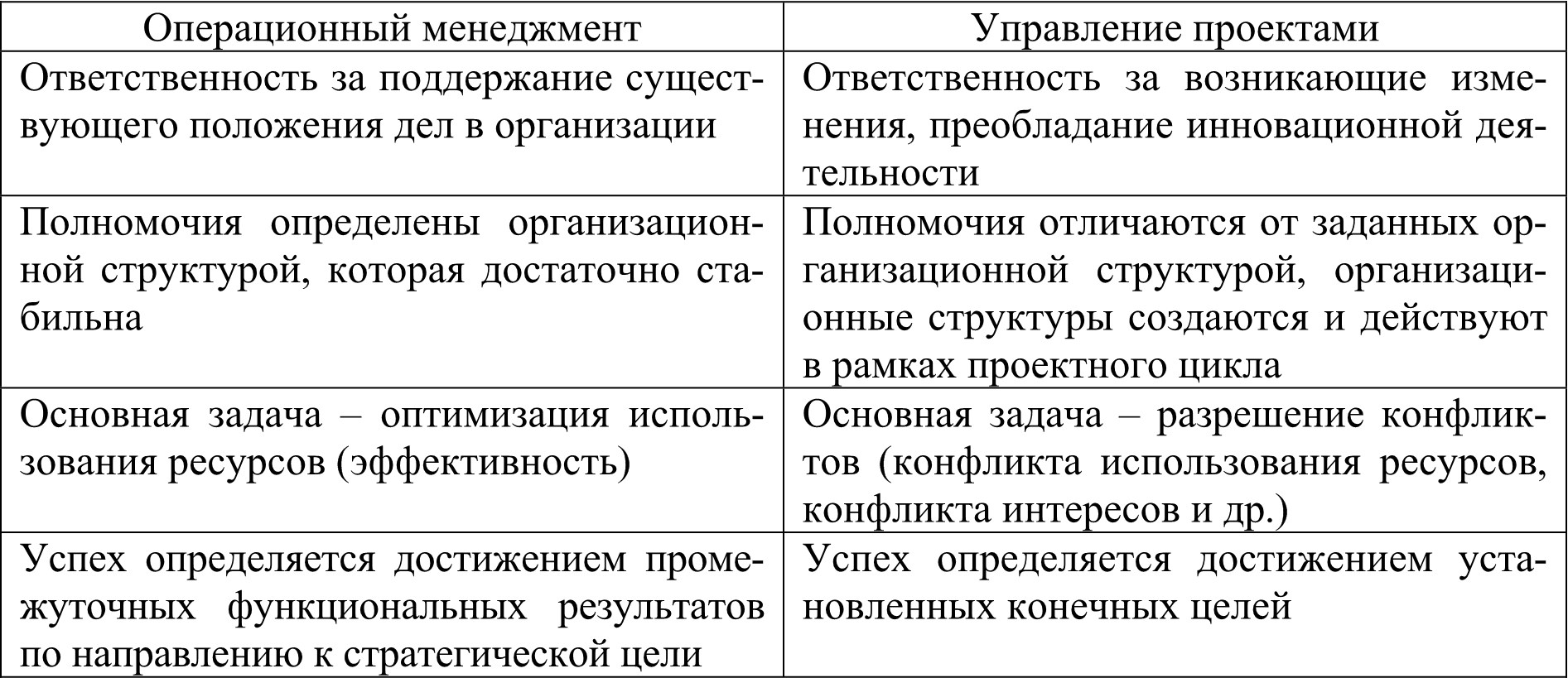 Особенности организации проекта обусловливают различия в подходах операционного менеджмента и управления проектами (табл. 1.3). Элементы проектной деятельности присутствуют практически в любой организации, однако роль и уровень развития проектного управления отличаются в зависимости от специфики деятельности. Проекты чаще всего рассматриваются как инструмент достижения стратегических целей организации, при этом управлению проектами отводится промежуточное положение между стратегическим и операционным управлением.