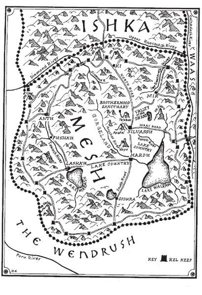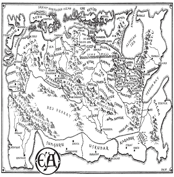 But across the valley twenty miles due east, Mount Eluru stood like a vast pyramid of granite and ice. Beyond it were still greater peaks of the Culhadosh Range, which separates the kingdoms of Waas and Mesh. In the distance to the south forty-five miles as a raven flies, was the hazy wall of the Itarsu in whose narrow passes my ancestors had more than once slaughtered invading Sarni armies from the great gray plains beyond. Behind us above the hills from where we had ridden that day, just to the west of the bear-infested woods that we proposed to enter, were three of the greatest and most beautiful peaks of the Central Range: Telshar, Arakel and Vayu. These were the mountains of my soul; here, I thought, was the heart of the Morning Mountains and possibly of all Ea. As a boy I had played in their forests and sung songs to their silent, stony faces. They rose up like gods just beyond the houses and battlements of Silvassu: the shining Vayu a few miles to the south, Arakel west just across the swift Kurash river, and Telshar the Great on whose lower slopes my grandfather’s grandfathers had built the Elahad castle. Once I had climbed this luminous mountain. From the summit, looking north, I had seen Raaskel and Korukel glittering beyond the Diamond River, and beyond these guardian peaks, the cold white mountains of Ishka. But, of course, all my life I have tried not to look in that direction.