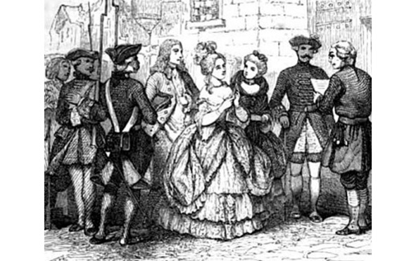 Актрису Клерон королевская стража приводит в тюрьму Фор-Левек (Гравюра из книги, напечатанной в 1794 году)