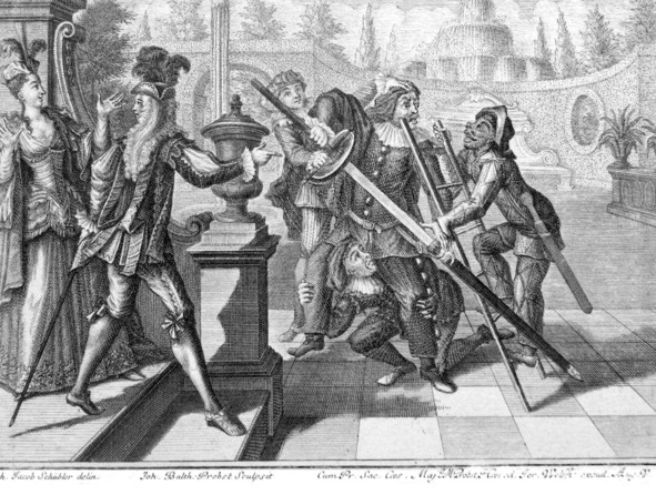 Сцена из спектакля Театра итальянской комедии (По гравюре XVII века)