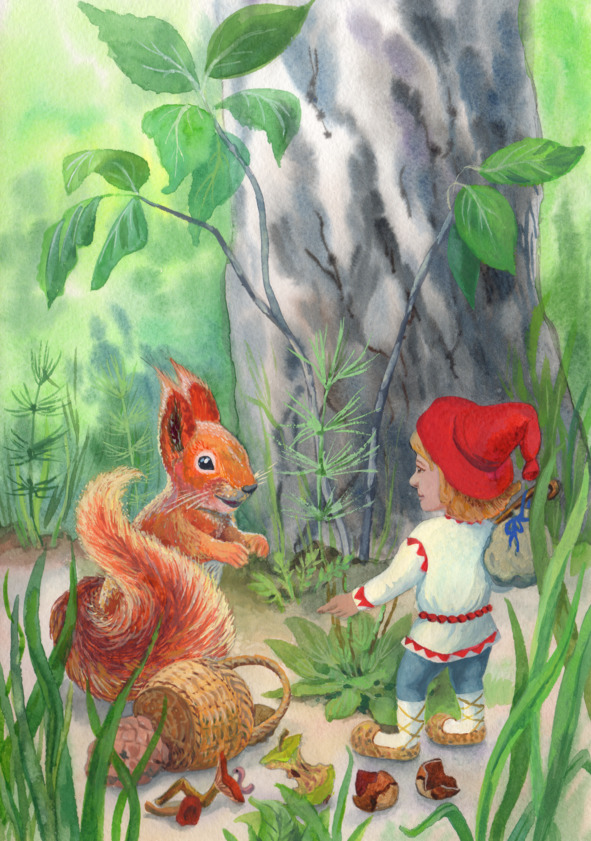 – О! Прости, пожалуйста, я думала, что на дорожке никого нет. Я убиралась у себя в дупле, – белочка так мило улыбнулась, что гному сразу захотелось с ней подружиться.