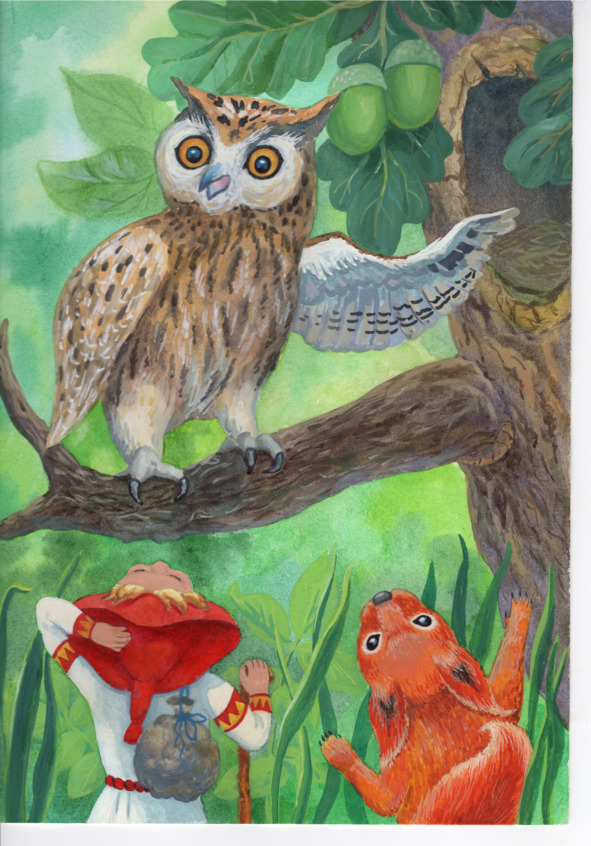 Тут они увидели сонную сову, выглядывающую из дупла. Она не спеша вышла и удобно расположилась на ветке. Когда сова рассмотрела их внимательно – с ног до головы – то была немало озадачена появлением в их лесу настоящего гнома.