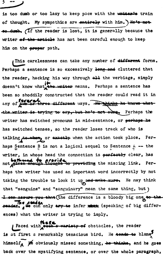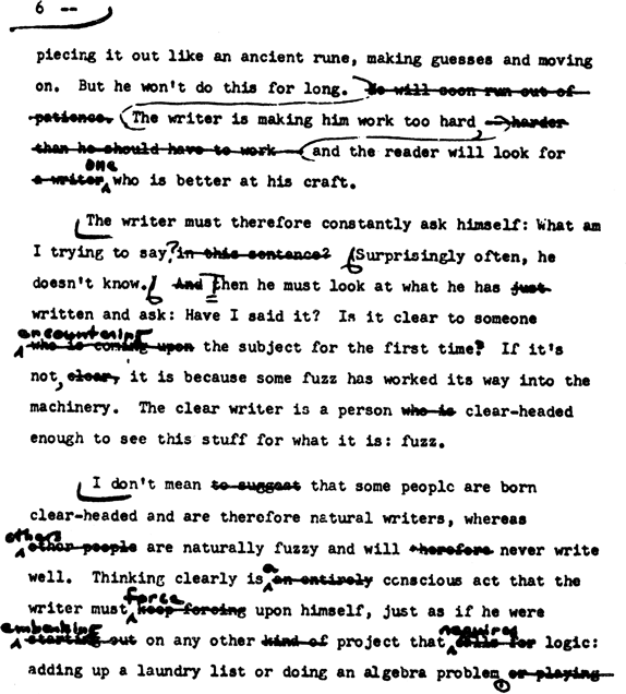 Две страницы последнего варианта рукописи этой главы для первого издания «Как писать хорошо». Хотя они выглядят как довольно сырой черновик, на самом деле они уже были переписаны и перепечатаны раза четыре или пять, как почти любая другая страница. При каждом переписывании я стараюсь сделать текст предельно сжатым, точным и выразительным, устраняя из него все, что не выполняет полезной работы. Затем я прохожусь по нему еще раз, читая его вслух, и всегда поражаюсь тому, как много мусора еще можно выкинуть. (В более поздних изданиях я устранил сексистское местоимение «он», означающее писателя и читателя.)
