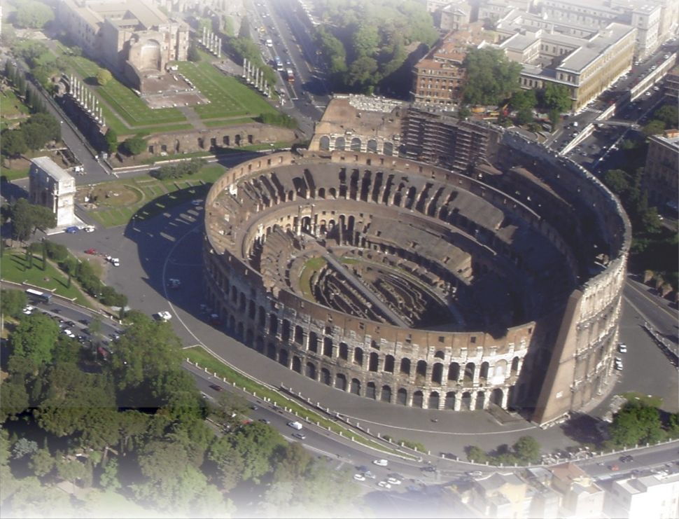 Oben: Rom, Kolosseum, Luftaufnahme. Foto. A. Blüher, Rom.