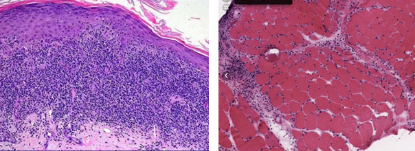 Рис. 1. Клеточный воспалительный инфильтрат в дерме при СКВ, слева (Х100). Такой же инфильтрат в поперечнополосатых мышцах при полимиозите, справа (Х100), по материалам [5]