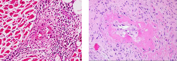 Рис. 2. Узелковый продуктивный миокардит при ревматической лихорадке, слева (Х100). Справа картина узелкового полиартериита, виден периваскулярный некроз и преимущественно мононуклеарная инфильтрация (Х100), по материалам [5]