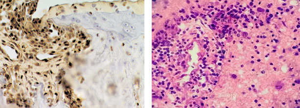 Рис. 3. Экспрессия HMGB1 при коллаген-индуцированном артрите, слева (Х100), по материалам [120]. Продуктивный васкулит, периваскулярная инфильтрация мононуклеарами, справа (Х100), по материалам [5]