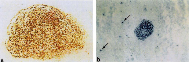 Рис. 4. Слева (а) представлен герминативный центр в интактной нёбной миндалине, справа (b) аналогичная структура в синовиальной оболочке при РА (Х 100), по материалам [88]